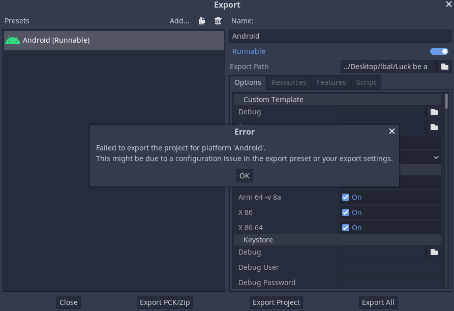 ...At least that's what I would show, but this process doesn't even result in an APK being created. After a lot of troubleshooting, I eventually realized that the custom build of Godot that I use that allows me to link to Steamworks (necessary for the game's Steam Achievements and Steam Workshop integration) was causing issues when trying to export to Android.