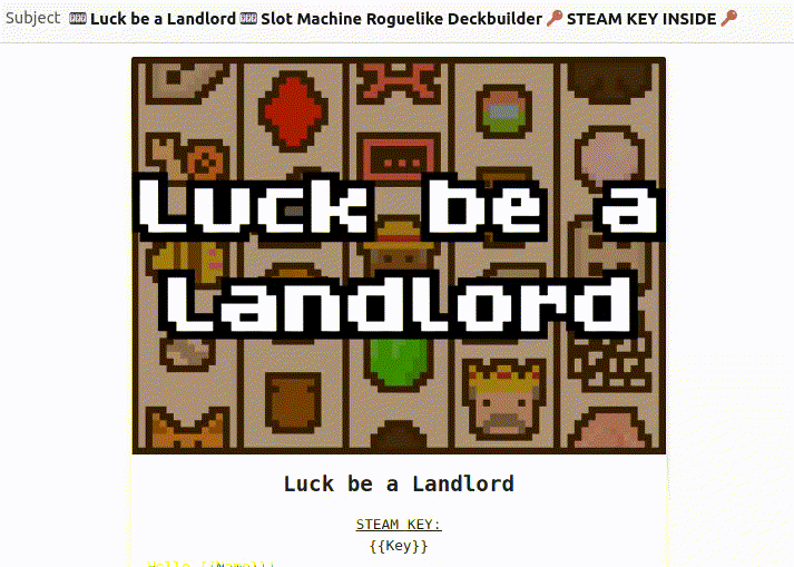 - Have the text "🔑 STEAM KEY INSIDE 🔑" somewhere in your subject line. A person is much much more likely to click on your email if they know that you've taken the step to provide them with a key for coverage.