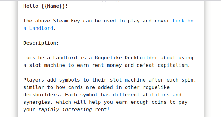 When actually mass-sending emails, make sure that the Steam Keys are unique for each email and that you replace variables like {{Name}}. To do this, I use a Thunderbird plugin called MailMerge, but I'm sure there are alternatives for other email clients.