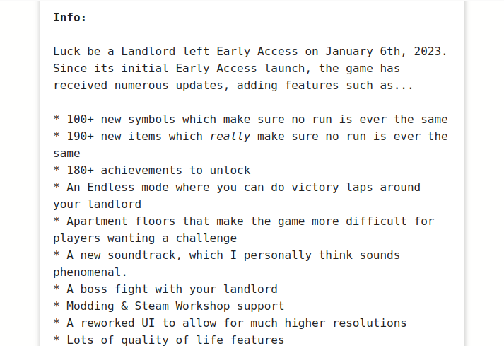 Many devs pay YouTubers 4 to 5 figure amounts to make a video of their game. This is a perfectly valid solution, but is outside the realm of possibility for many people. It's something I couldn't afford when I started marketing Luck be a Landlord, and I've still yet to pay for coverage, so we won't be talking about this aspect further. It's entirely possible to successfully market your game with a $0 marketing budget.