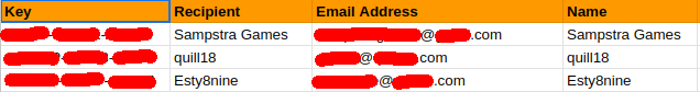 I keep a spreadsheet of all the email addresses I'll email with each update, along with a unique Steam Key for each address. It also doesn't hurt to keep a column for how you'll refer to each YouTuber, in case you know a name they prefer to go by instead of their username. Don't just assume you're on a first-name basis with them, though.