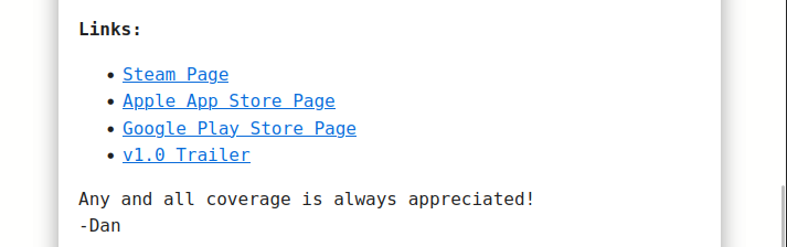 - When a YouTuber covers your game, add them to a separate spreadsheet so you can change the email body text when you follow-up with game update emails. You can remove the Steam Key and put something like "Thank you for your continued coverage of my game!"