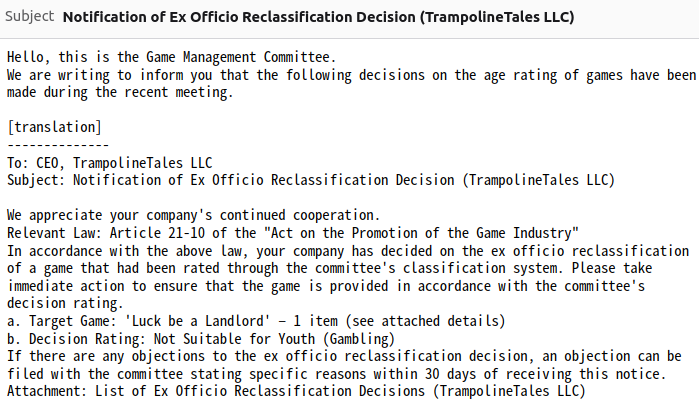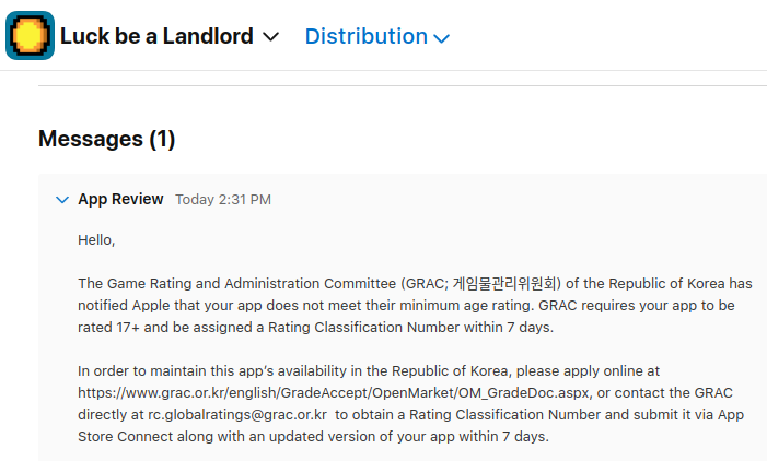 I was told that if I disagreed with this decision I should file an objection, which I did. I was ignored and the game is now going to get banned in South Korea on the Apple App Store (which was completely unaffected until I applied for a GRAC rating) this week, and will likely be re-banned on the Google Play Store as well.