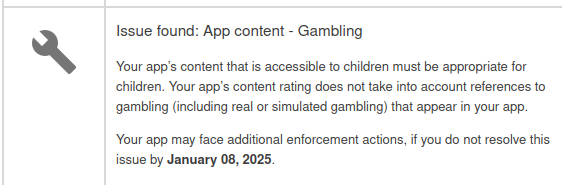 I've now filled out the Google Play age rating questionnaire to "agree" that my game "contains gambling." I'm doing this in an attempt to stop my game from being banned globally on Google Play since every time I've tried to appeal these decisions I've simply been sent a screenshot of my game and was told "this is gambling."